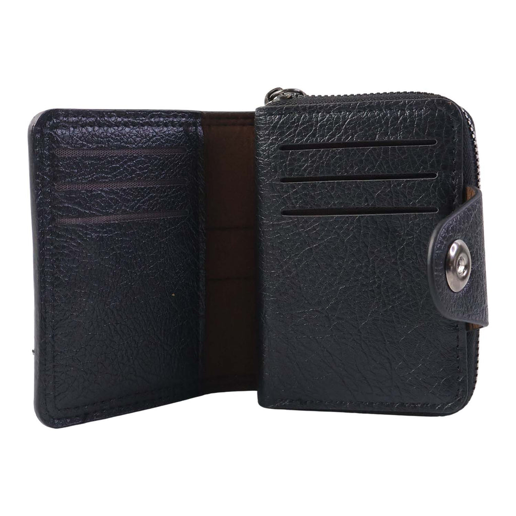 This premium black card holder wallet is crafted to keep your cards and small essentials organised in a compact yet spacious design. The wallet features a secure snap closure section with multiple card slots on the outside and an additional zip-around compartment with an accordion-style interior that expands to neatly hold numerous cards. The textured finish gives it a classy, professional look, while the combination of zip and snap closures ensures maximum safety of your valuables. Easy to carry in pockets, sling bags or backpacks, this wallet is ideal for managing ATM cards, ID cards, business cards, travel cards and folded currency—all in one refined accessory designed for daily convenience.
