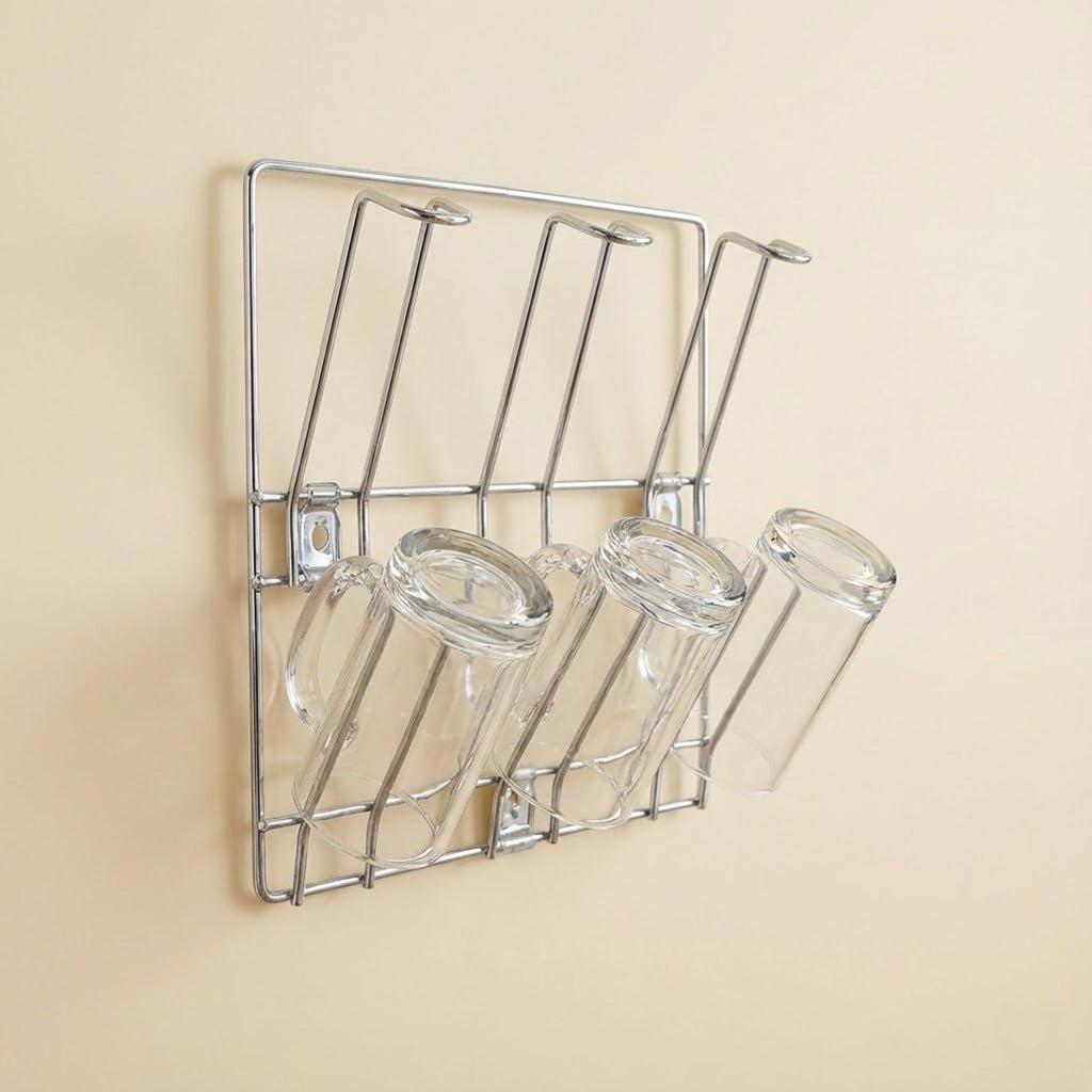 Wall-Mounted Stainless-Steel Cup & Mug Holder Rack with Adhesive Hooks – Space Saving Glass Drying & Storage Organizer for Kitchen & Dining Area (25 × 25 cm, 1 Pc)